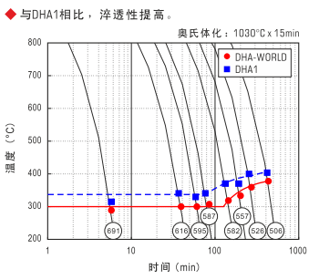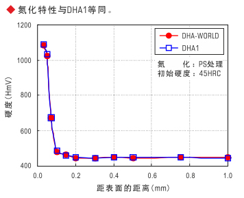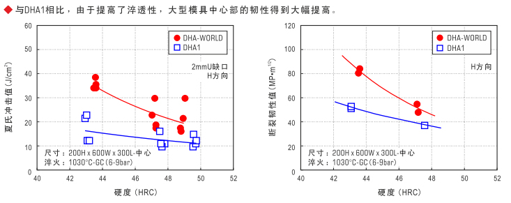 優(yōu)異的淬透性…通過對(duì)DHA1(JIS-SKD61相當(dāng))成分最優(yōu)化設(shè)計(jì),大幅改善了淬透性,熱處理操作容易,大型模具中心部也可以獲得高韌性。