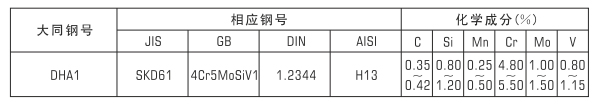 大同的JS-SKD61相應(yīng)鋼種。耐磨損性、耐熱龜裂性優(yōu)異。
